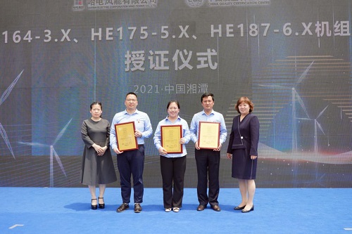 中国质量认证中心市场总监兼新能源产品认证部经理邢合萍在揭牌仪式现场为哈电风能三项新产品颁发认证证书并致辞。邢合萍指出,本次颁证仪式所涉及的机型是哈电风能根据我国地域及风资源情况,开发的复杂山地低风速机组、三北大基地陆地大容量机组及新一代海上机组,代表了哈电风能未来在风电产业全面发展的决心和战略。她表示,中国质量认证中心将一如既往地竭诚为哈电风能提供更优质的服务。