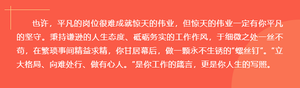 印度诗人泰戈尔曾说:“花朵的事业是美丽的,果实的事业是尊贵的,但我愿做一片绿叶,绿叶的事业是默默地垂着绿荫的。”这种绿叶精神在罗奕春身上就有很好地体现。作为办公室一员,出成绩时可能是无名英雄,寂寂无闻;在遇到问题时,可能成为矛盾的焦点,尝尽酸甜苦辣;有时候还得代人受过,委曲求全,但他都坦然处之。