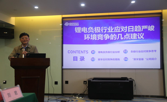 本次会议分为行业分享和资源对接两个环节。首先,被投企业宸宇富基首席科学家、中南大学博士生导师周向阳教授以“锂电负极行业应对日趋严峻环境竞争的几点建议”为题,进行了深度分享。