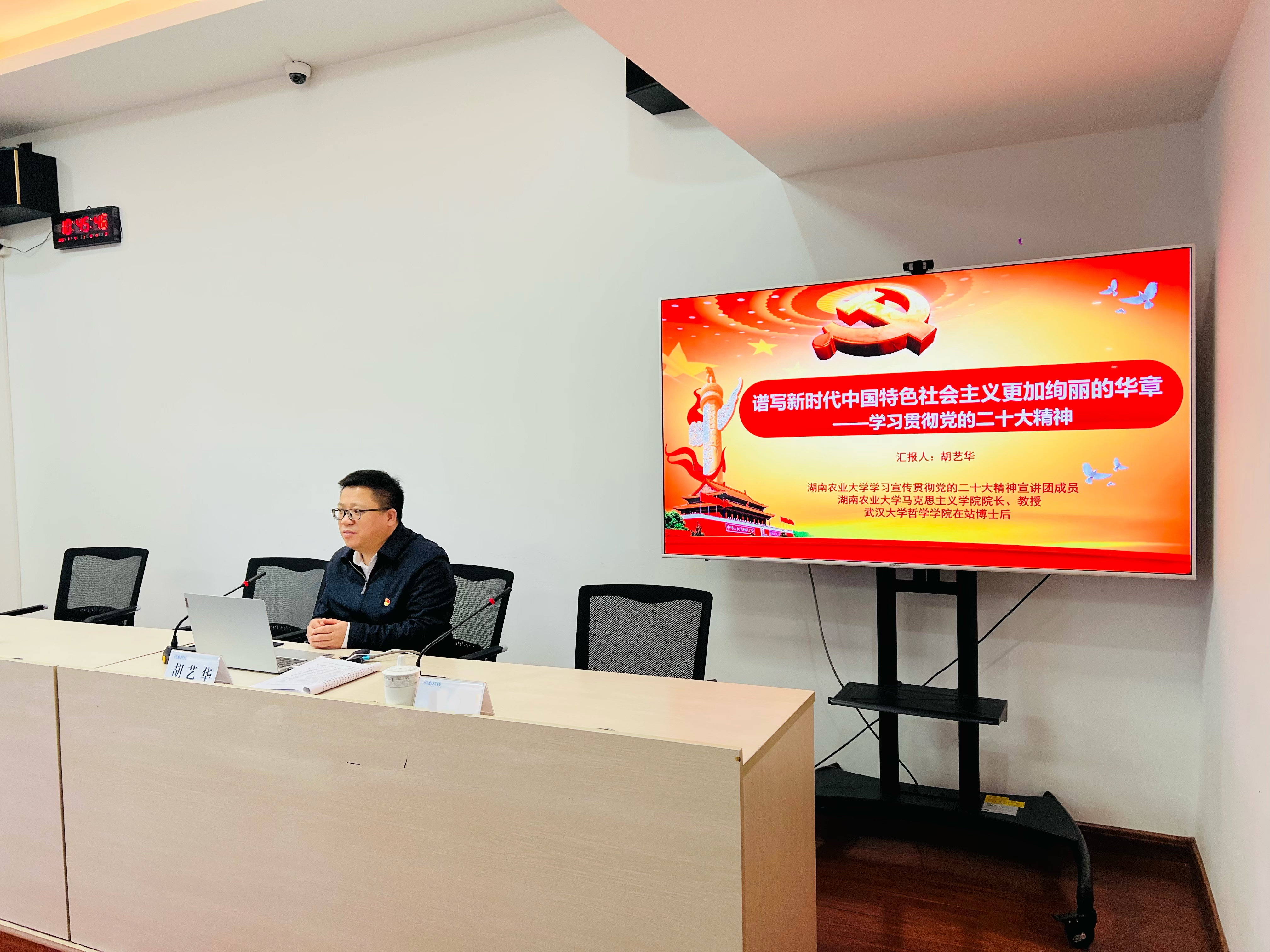 湖南农业大学马克思主义学院院长胡艺华教授以《谱写新时代中国特色社会主义更加绚丽的华章》为题,从“全面领会党的二十大的主题及主要成果、深刻认识新时代十年的伟大变革及其里程碑意义、不断开辟马克思主义中国化时代化新境界、牢牢把握新时代新征程中国共产党的使命任务、贯彻落实新时代新征程的战略部署和用新的伟大奋斗创造新的伟业”六个方面,作党的二十大精神宣讲辅导。参会人员纷纷表示,宣讲深入浅出,深受教育、倍受启发。下一步,将深入学习领会党的二十大精神,强化理论武装,融会贯通,切实用党的二十大精神统一思想、统一行动,为公司高质量发展新征程贡献自己的力量。