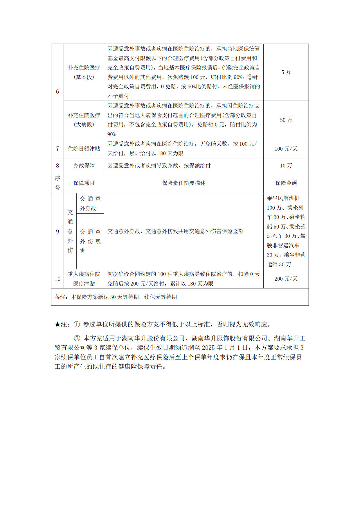 为了更好的与基本医疗保险有效衔接互补,进一步减轻员工重大疾病及意外事故医疗费用负担,建立合理、完善的员工福利保障体系,更好满足员工多层次、多元化医疗保障需求,不断增强员工的获得感与幸福感,湖南华升股份有限公司计划为全体员工每人购买一份补充医疗保险(全体职工均缴纳了职工医疗保险或城乡居民医保),现采用公开招标的方式委托该项目,诚邀符合条件的机构参与竞标,具体情况如下:
