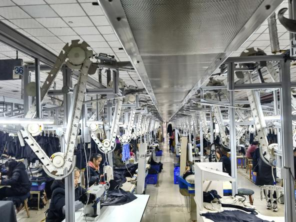 走进生产车间,裁剪、缝制、定型、整烫……各条生产线有序运转,计划、品控、供应、仓库等全部就位,智能吊挂流水线上,一件件高标准产品正在快速流转下线,员工热情饱满,干劲十足。在服装展厅,员工打扫一新,一件件款式新颖的服装排列整齐,正式开门营业。