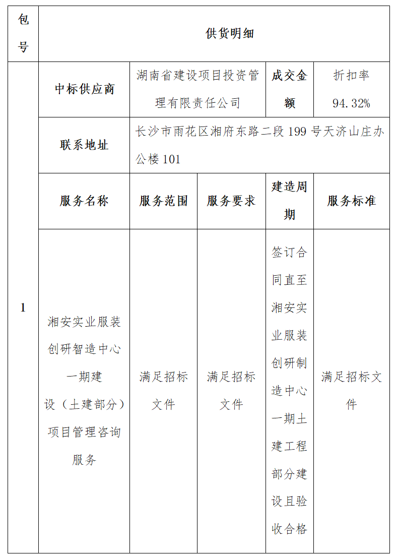 摘要:湘安实业服装创研智造中心一期建设(土建部分)项目管理咨询服务中标公告